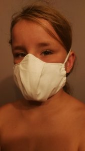 Ah, la couture répétitive du moment (je suis en train d’en faire pour mon étudiante : 5 jours 1/2 d’internat = 18 masques au minimum !). C’est sympa que chacun ait pu choisir son patron préféré. J’ai testé le mask attack et ici, il ne nous convient pas du tout.