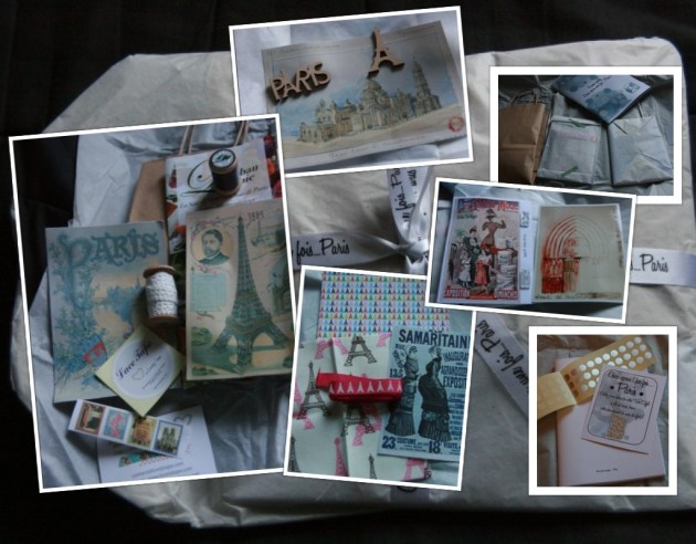 Que du bonheur : du papier de soie noir à paillettes, un sac en tissu parfumé (j’adore quand en plus ça sent bon !) et badgé, des bonbons si jolis qu’on n’ose pas les manger, de la laine naturelle, des aiguilles en bambou… Top !