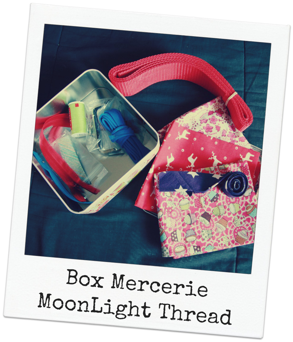 Et enfin, je profite de cet article kits et box pour vous montrer ce que j’avais gagné chez MoonLight Thread au mois de décembre (oui, il serait temps que je montre aux non-facebookiennes) : une jolie boîte remplie de mercerie : mini coupons de tissu, passepoil, fermeture à glissière, fil, biais maison, ouverture de porte-monnaie, sangle…