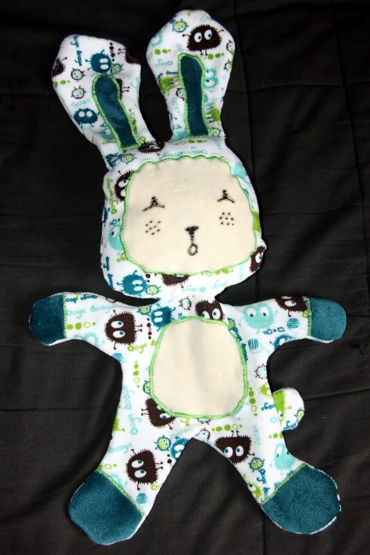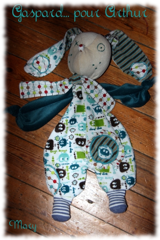 Un doudou lapin prénommé Gaspard offert à un petit Arthur qui a vu le jour au mois de Mai. Beaucoup moins réussi que je ne l’espérais…