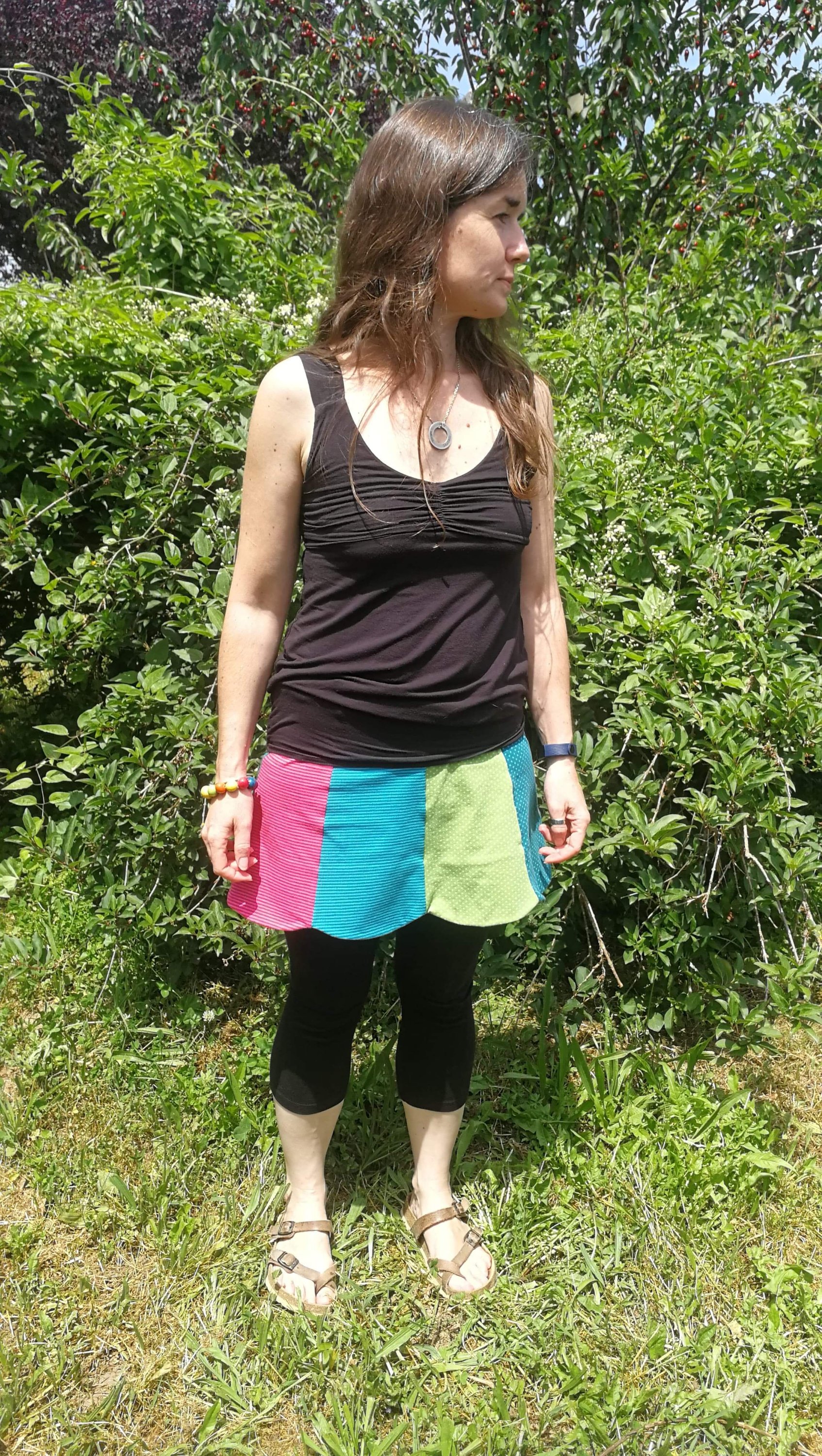 C’est une Lipsi, patron de l’Usine à Bulle. J’ai opté pour la version courte, rallongée quand même de 3 centimètres. En jersey, donc pas de fermeture à glissière, juste un élastique dans la ceinture (qui est doublée). Il faudrait d’ailleurs que je découse pour raccourcir l’élastique.