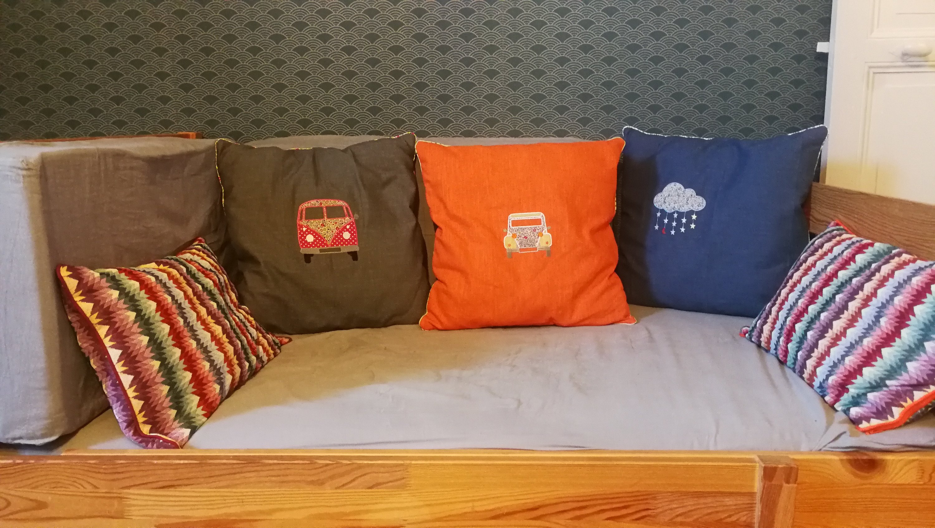 Ce week-end, cousettes faciles pour habiller la banquette du nouveau bureau / atelier / bibliothèque / chambre d’amis.