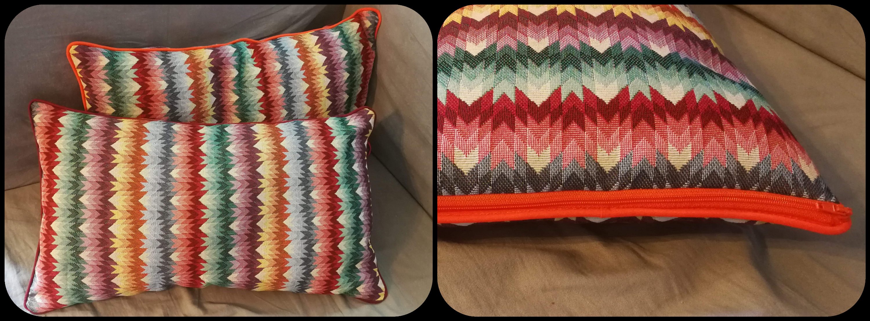Tissu jacquard, passepoils orange et bordeaux et fermetures à glissière (Mondial Tissus)