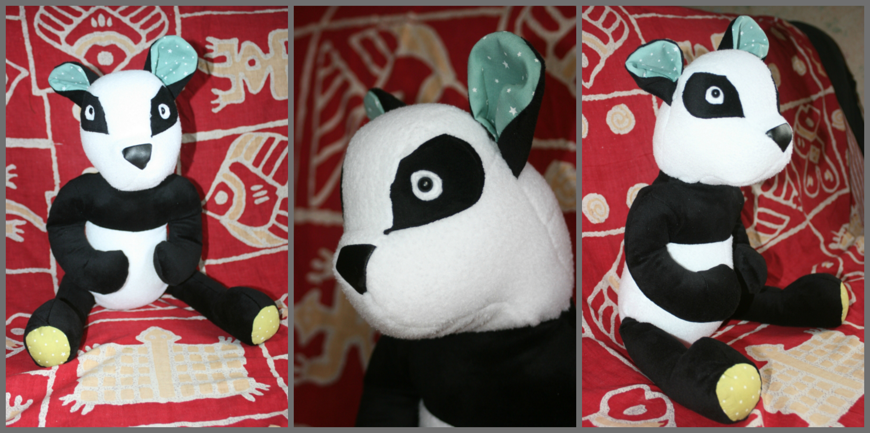 Non, ce n’est pas un effet d’optique : les taches des yeux ne sont pas à la même hauteur, en plus d’être inversées… Et comme j’avais oublié de tripler les oreilles, elles étaient flagada et j’ai dû rajouter un point pour qu’elles tiennent en l’air. Vous devriez en voir une autre version parce que Nahel, mon cadet en a réclamé un. Il va juste falloir être patient : plein plein plein d’autre choses à coudre avant !