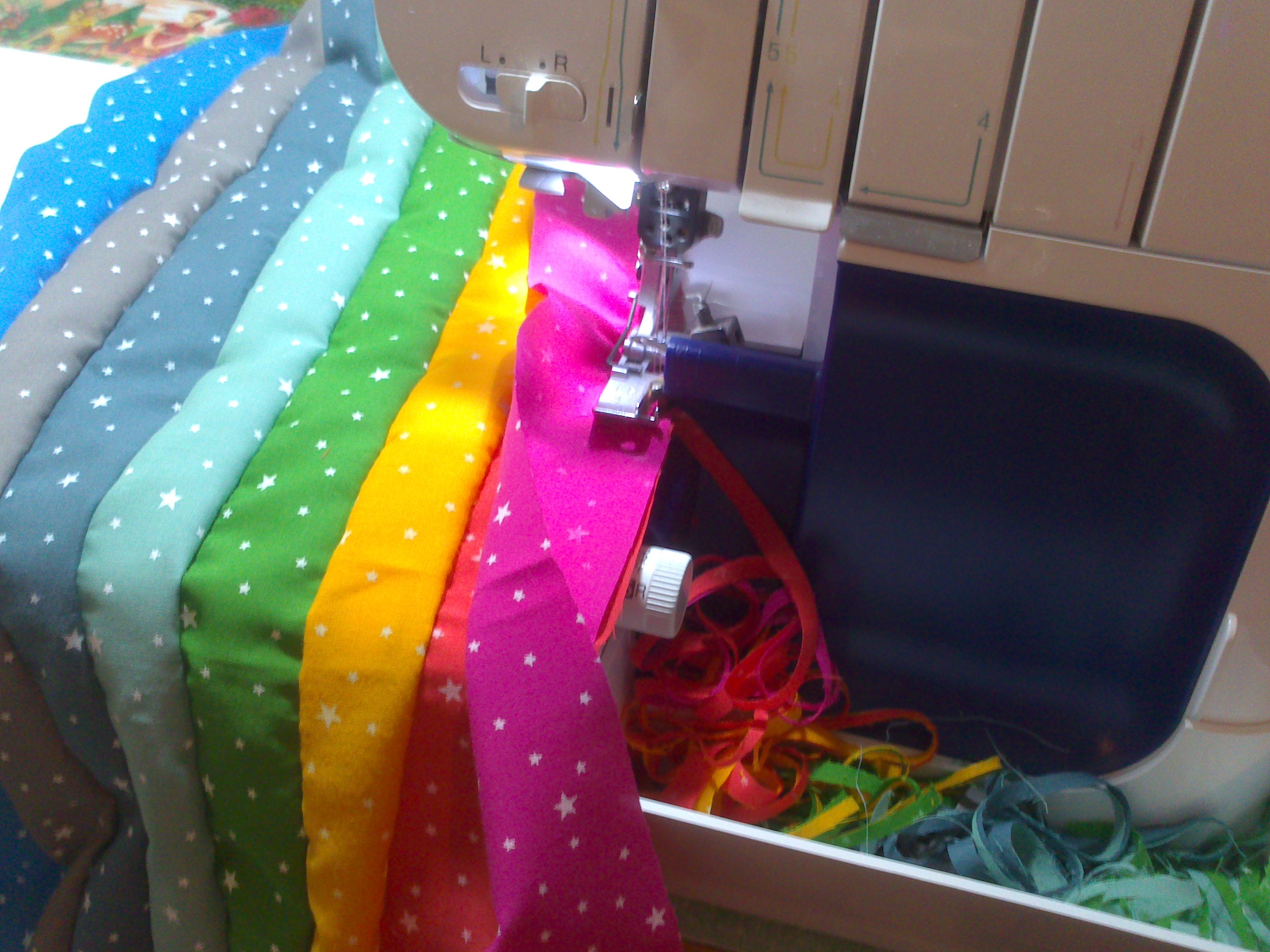 Il me fallait l’agrandir un peu, le rembourrer et ce serait parfait. Et c’est pour lui que j’avais assemblé l’arc-en-ciel qui sert de couverture au blog et à sa page FB. Pour le rembourrer, j’ai décidé d’utiliser du Bulgomme en triplure de la polaire (pour que ce soit tout doux à l’intérieur) :