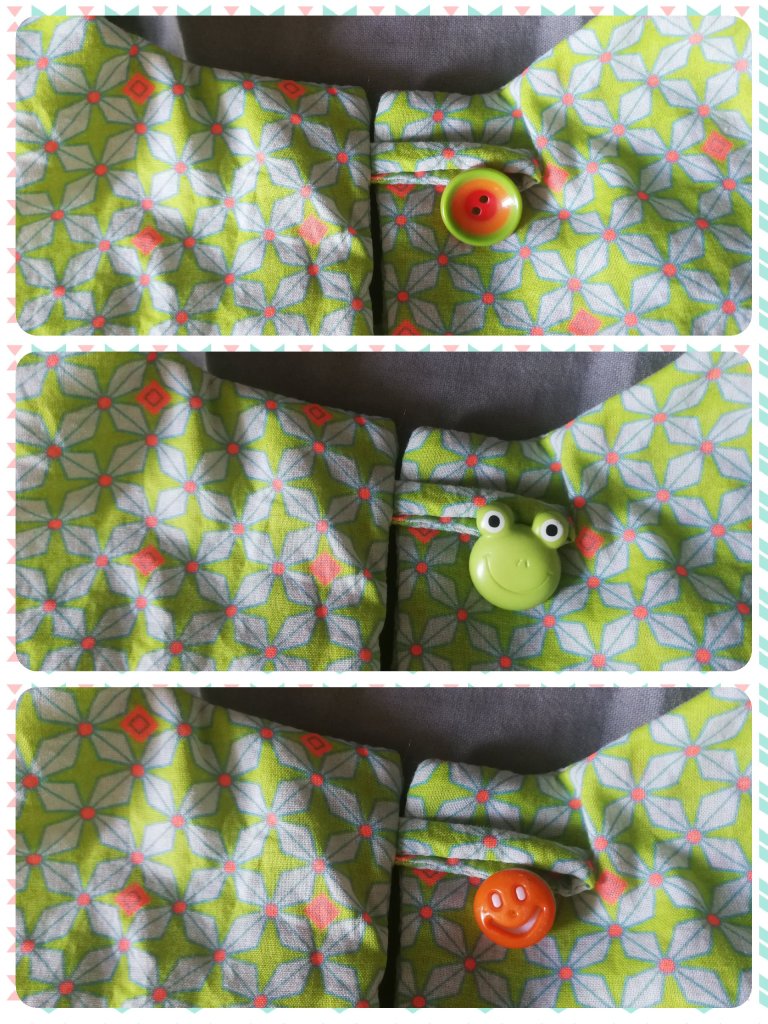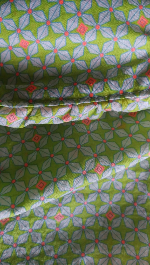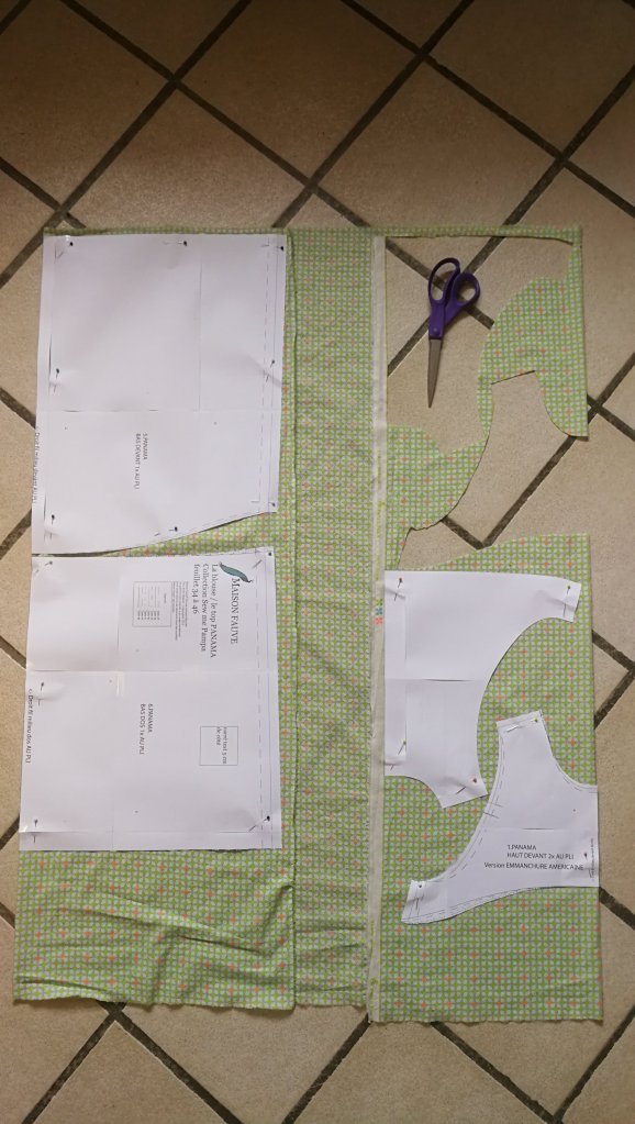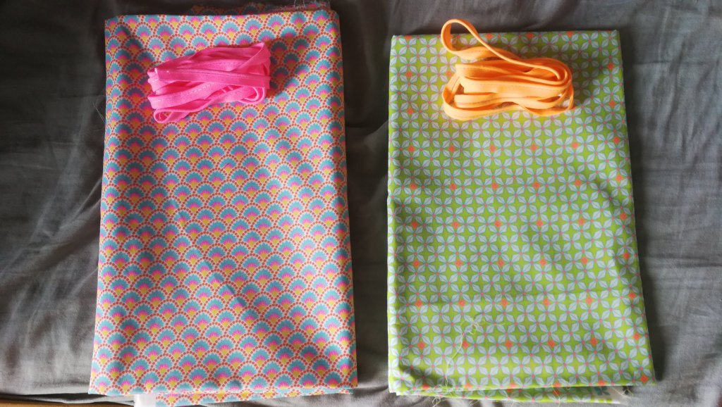 Edit du 26 : le plan de coupe proposé prévoit l'utilisation d'1,60 m de tissu. Si comme moi vous utilisez un tissu dont le motif n'a pas de sens (ou un tissu uni), 1 m suffit largement.