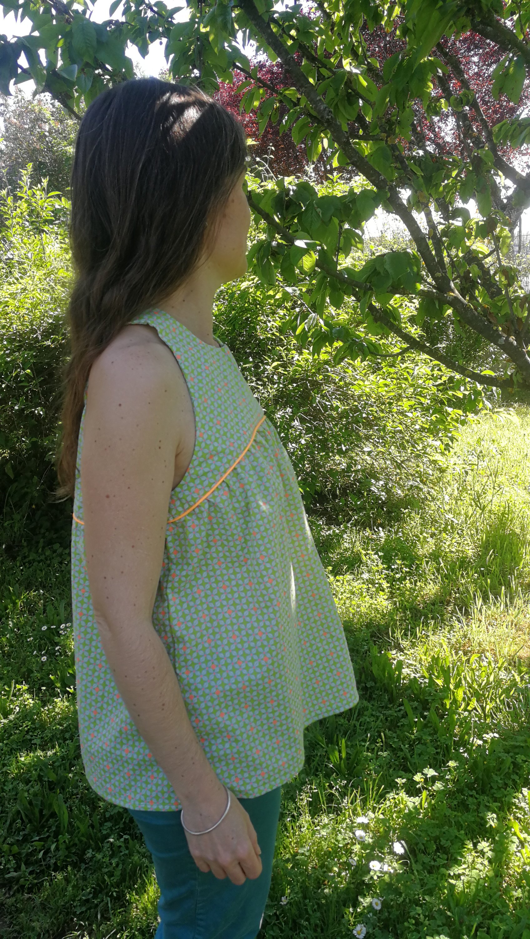 J’ai légèrement modifié le montage pour « cacher » le surfilage au niveau de la couture entre le haut et la basque, comme pour la Datura (tiens, il y a un bout de fil qui dépasse).