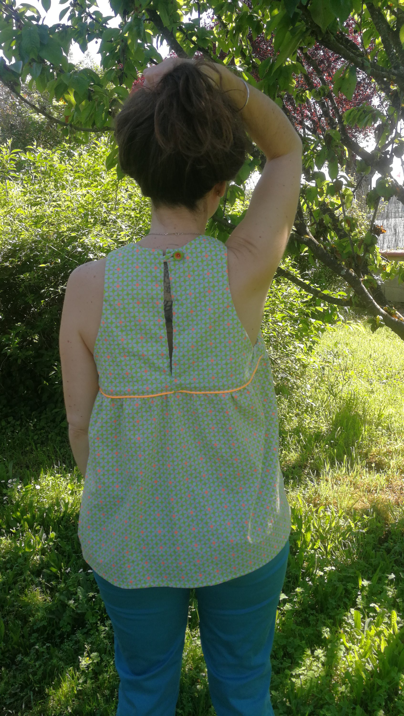 J’avais cousu le top Leaf en taille 36, et c’était un peu juste (je l’ai d’ailleurs démonté hier pour le modifier). Du coup, j’ai opté les yeux fermés pour la taille 38. Mais cette fois, je pourrais facilement enlever 4 cm de chaque côté sous les emmanchures… C’est sans doute la coupe qui veut ça, parce qu’au niveau du cou ça va, de même pour l’ampleur de la basque en bas. Mais si je couds à nouveau ce modèle, je réduirai un peu les côtés.