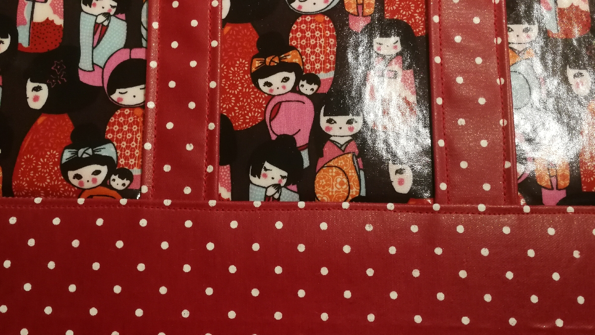 Extérieur : tissus enduits rouge à pois blancs et kokeshis PPMC