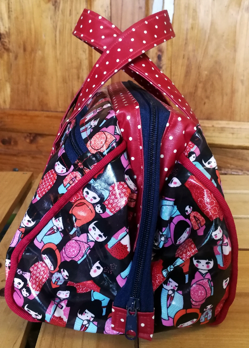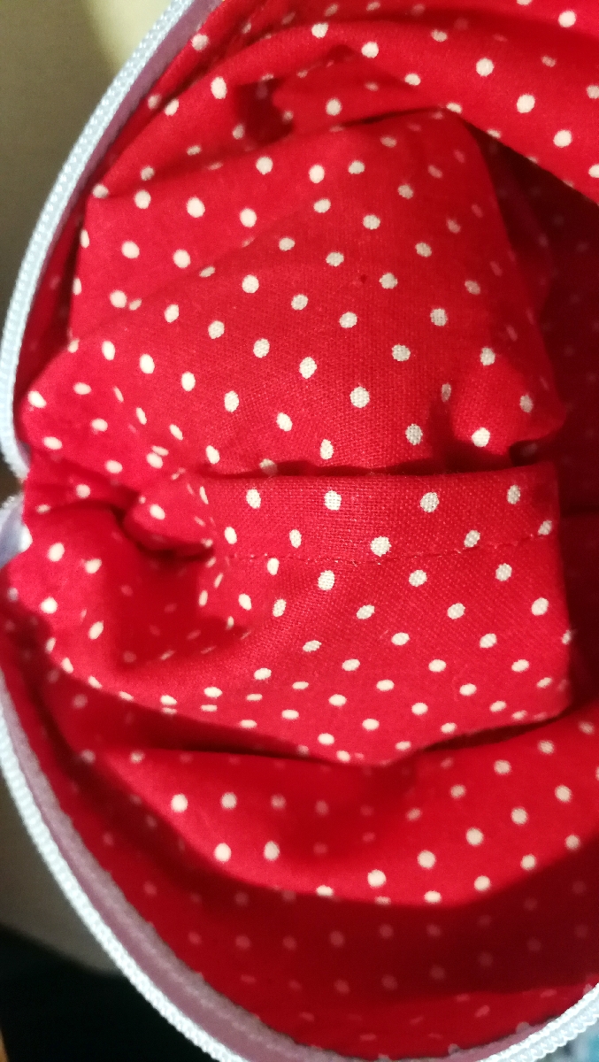 Intérieur : coton blanc à pois rouge + tissus enduits pour la double-trousse + fermetures