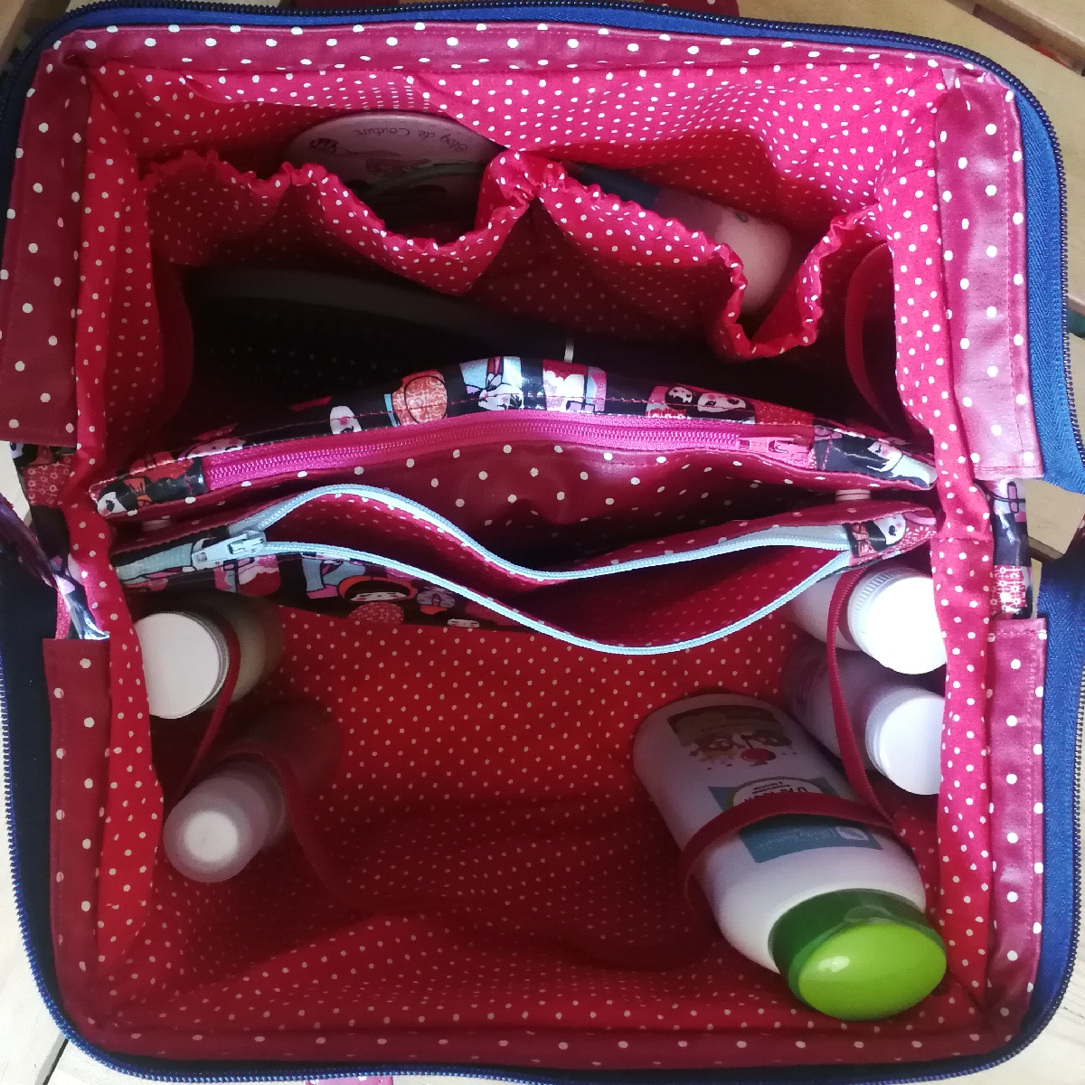 A l’intérieur, j’ai choisi d’ajouter des compartiments, des élastiques (placés un peu trop haut) et une double trousse amovible. J’ai choisi d’assembler la trousse en faisant des coutures anglaises. Elle est maintenue « pliée » par 2 pressions résine et accrochée aux bords par des pressions métal.