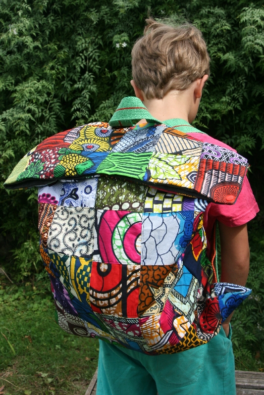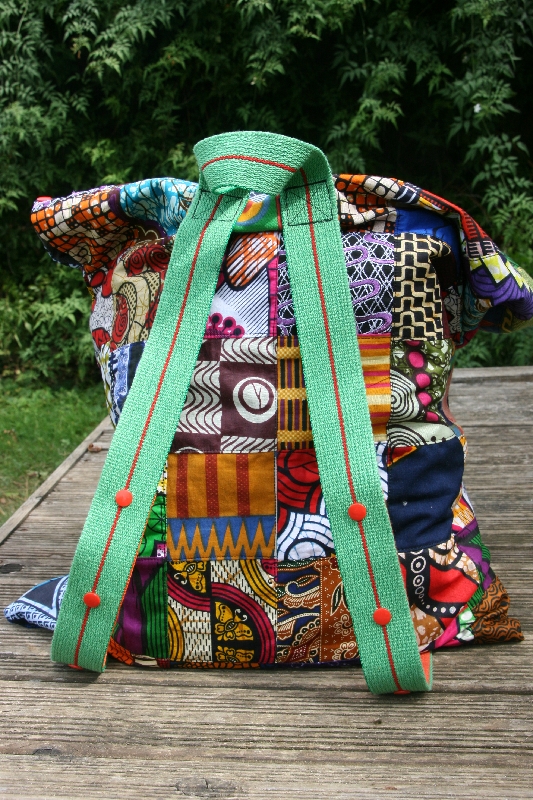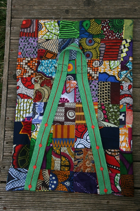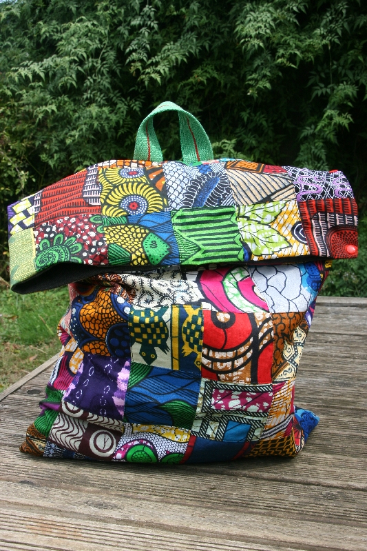 Et du wax, il m’en restait plein (et il m’en en reste encore beaucoup 😉 ) ! Céleste (oui, la mascotte éléphant s’appelle finalement Céleste) avait besoin d’un sac pour voyager dans les famille de mes élèves. Comme c’était trop difficile de choisir, j’ai décidé de prendre un peu de chaque tissu. J’ai donc coupé 88 carrés de 10x10cm, dans 44 tissus différents ; et voici le résultat :