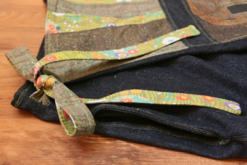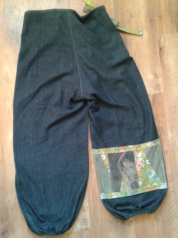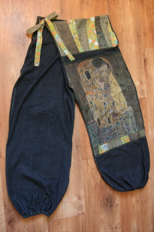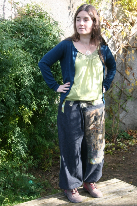 J’avais tous les tissus depuis tout ce temps : du jean, plutôt fin, et un coton Ghastlies de la mort-qui-tue-grave. Bon sauf qu’Alexander Henry n’est pas encore reconnu comme un artiste, hein ! Alors j’ai eu envie d’un tissu représentant l’arbre de vie de Gustav Klimt (de toute façon, ce patron et ce peintre étaient fait pour se rencontrer, non ?). Mais impossible d’en dégoter. Un tableau moins connu sur le thème de la maternité me plaît aussi énormément, mais là, je pense qu’aucun tissu n’a jamais existé. Alors je me suis rabattue sur le baiser. Le coupon n’étant pas assez grand pour couvrir tout le pan du pantalon, j’ai craqué pour d’autres tissus à marier avec (comment ça, toutes les excuses sont valables ?). Oui, je sais, il y avait aussi la possibilité de faire moi-même mon arbre de vie en appliqués mais ça, je ne me le suis pas senti du tout du tout. Une autre fois, peut-être, quand je serai devenue grande.